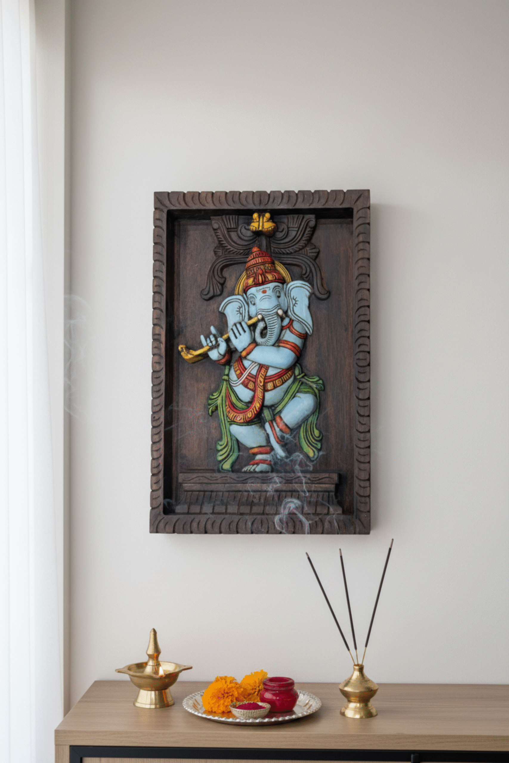 - Intricate Carving: The centerpiece features a detailed sculpture of Lord Ganesha seated, possibly within a traditional archway or prabhavali. The carving work on the figure, particularly the face, trunk, and ornaments, is highly detailed, reflecting skilled craftsmanship.